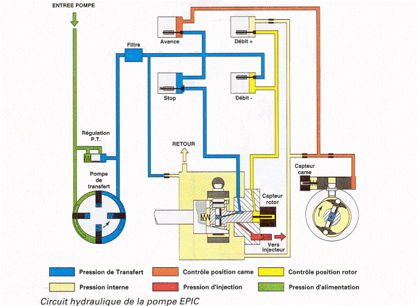 Pompa de injectie a sistemului EPIC este o pompa rotativa distributiva. Dozajul este realizat prin limitarea cursei plonjoarelo. Aceasta limitare depinde de pozitia axiala a rotorului glisant. Pomparea provine din deplasarea plonjoarelor, împinse prin ansamblul patina/galet sub efectul profilului camei.