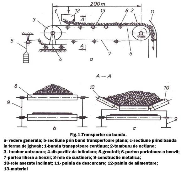 Se compune dintr-o banda continua 1, infasurata pe doua tambure, din care tamburul 2 este de actionare, fund pus in miscare de un motor electric prin intermediul unui reductor sau transmisiei prin curele trapezoidale. Tamburul de actionare este amplasat in fata, la palnia de descarcare, in directia de transport a benzii. Tamburul de intindere este antrenat de banda si el are rolul de intindere abenzii (fig.1, a).