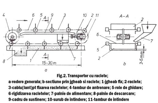 Transportorul cu raclete (fig.2) este format dintr-un jgheab dreptunghiular fix prin care se deplaseaza racletele 2, fixate din loc in loc pe un cablu sau lant