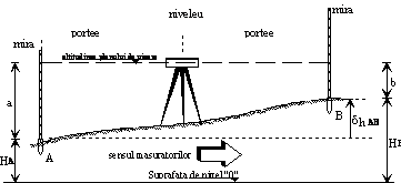 Pentru determinarea diferentei de nivel ntre doua puncte sau pentru determinarea cotei unui punct c nd se cunoaste cota unui alt punct aflat n apropiere se poate amplasa pe fiecare din cele doua puncte c te o mira, iar aproximativ ( n limita a 2-3m diferenta) la mijlocul distantei, fara a fi obligatoriu sa fie si pe aliniamentul format de cele doua puncte, se amplaseaza o nivela. Prin citirile efectuate pe cele doua mire se pot determina marimile descrise mai sus. Distanta ntre aparat si una din mire se numeste portee, n timp ce distanta ntre mire se numeste niveleu. Din figura 7.4 se vede ca HA si HB sunt cotele celor doua puncte, dintre ele numai prima fiind cunoscuta. Pe mire se fac citirile a si b. Daca notam cu ?hAB diferenta de nivel ntre A si B, rezulta ca: