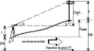 Dupa cum se observa, aparatul este asezat deasupra punctului A. naltimea "i" a instrumentului se masoara cu o ruleta.Relatiile de calcul devin :