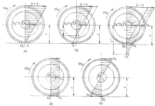 Daca axa instantanee de rotatie I este plasata sub zona de contact a rotii cu calea de rulare (fig. 37,c), iar zona de sprijin se deplaseaza in sensul deplasarii autovehiculului cu viteza vd, roata se rostogoleste cu alunecare, iar viteza reala va de deplasare a autovehiculului este mai mare decat cea teoretica vt.