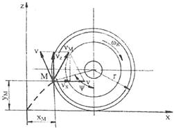 In figura 38 este prezentata schematic o roata de raza r, care se rostogoleste fara patinare sau alunecare cu viteza unghiulara wr pe un drum nedeformabil. Pe circumferinta rotii se considera un punct M, care se rostogoleste cu un unghi y La un anumit moment, punctul considerat are o viteza de rotatie v=r*wr in jurul centrului rotii si o viteza de translatie de aceiasi valoare v. Prin compunerea celor doua viteze se cbtine o viteza rezultanta vm ale carei componente vx si vz se pot determina grafic sau analitic. Marimea vitezei vm si a componentelor sale vx si vz depinde de pozitia punctului considerat.