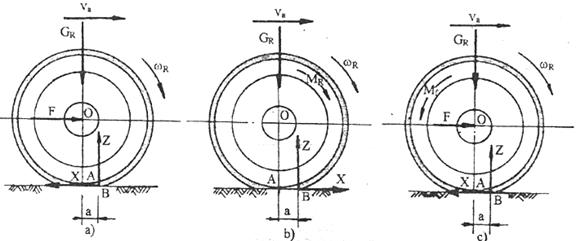 In functie de fortele si momentele care actioneaza asupra rotilor de autovehicule acestea pot fi: roti motoare sau antrenate, cand asupra lor actioneaza un moment motor MR, care are acelasi sens cu viteza unghiulara wR roti conduse sau neantrenate, cand asupra lor se aplica forte de impingere sau de tragere F, care au acelasi sens cu sensul de deplasare sau forte de retinere de sens opus sensului deplasarii; roti franate, cand asupra lor se aplica un moment de franare Mf, care are sens opus celui al vitezei unghiulare wR