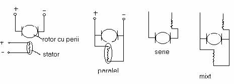 Functionarea: se alimenteaza infasurarea statorica rezultand un flux fi; se alimenteaza si infasurarea rotorica (indusul) prin periile sale de la reteaua U determinand un curent Ia; interactiunea dintre fluxul de excitatie statoric si curentul Ia din rotor creaza un cuplu ce va roti rotorul.