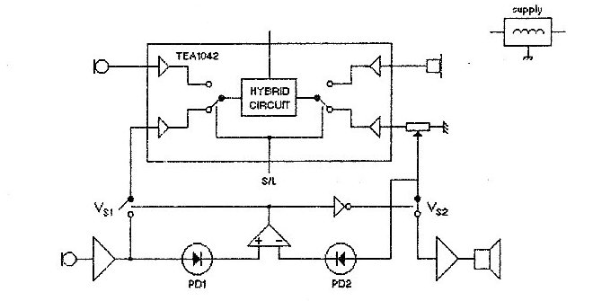 Semnalele de emisie si de receptie controleaza deschiderea unuia dintre contactele V1S sau V2S,prin diodele PD1,PD2,amplificatorul diferential si inversor,pentru a conecta la linie microfonul sau receptorul în functie de cerintele impuse de amplitudinea semnalului.