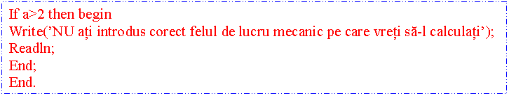 Daca din greseala utilizatorul introduce o cifra mai mare decât doi sau mai mica decât 0 atunci programul va afisa faptul ca nu s-a ales corect felul de lucru mecanic.