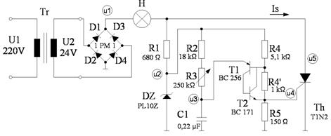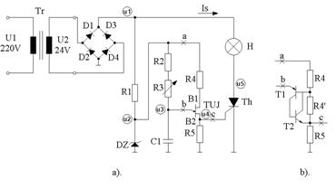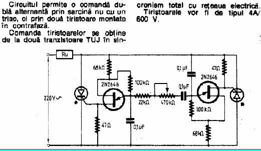 Un redresor comandat se obtine dintr-un redresor necomandat in care diodele (sau o parte dintre ele) se inlocuiesc cu tiristoare - fig.1a.d. O schema practica de redresor comandat monofazat bialternanta - utilizabil cu sarcina rezistiva, impreuna cu circuitul de comanda este prezentat in fig.2. Circuitul de comanda este un oscilator de relaxare realizat cu un tranzistor unijonctiune (sau un circuit echivalent - fig.2b), sincronizat cu reteaua de alimentare, prin circuitul formator realizat cu dioda Zener DZ si rezistorul R1.