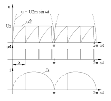 Diagramele de functionare ale redresorului sunt prezentate in fig.2c. Marimea de comanda pentru tensiunea redresata este unghiul aI amin amax ], care reprezinta, in timp, intarzierea impulsului de comanda fata de momentul trecerii prin zero a tensiunii de alimentare. Valoarea tensiunii medii redresate este: