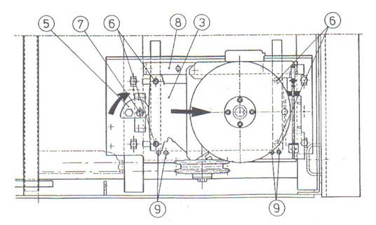 Se distribuie sageata (x) in ambele impletituri ale lantului prin invartirea centrifugei . Slabiti cele patru suruburi (6) ale unitatii de actionare . Cheie tubulara de 30 mm si prelungitor de 1 m . Se slabeste piulita de strangere (7) a excentricului . Mutati unitatea de actionare (3) cu ajutorul excentricului (5) pana cand sageata (x) ajunge la 10 - 15 mm . Se strang piulita de strangere (7) a excentricului si cele patru suruburi (6) . Suruburile slabite (6) pot determina o usoara inclinare a unitatii de actionare atunci cand se intinde lantul . Verificati din nou tensionarea lantului dupa strangerea suruburilor . Unitatea de actionare nu trebuie sa fie mutata la mai mult de 15 mm fata de pozitia initiala din timpul ansamblarii din fabrica .