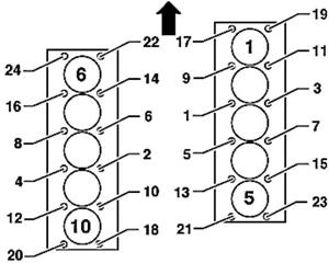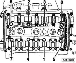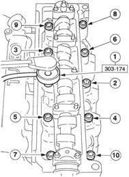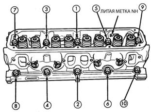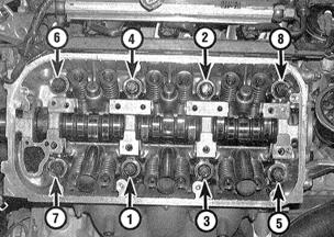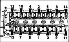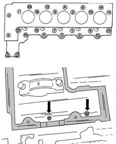 suruburile sau prizoanele chiulasei se strang in ordinea indicata de fabricant, dar, in general, se incepe cu cele de la mijloc si apoi in cruce, pana la cele de pe extreme (fig. 1-7); operatia se face cu cheia dinamometrica, cu momentul indicat dupa tipul motorului (155-165 N*m la D 797-05; 180 N*m pentru D 2156 HMN 8; 55-60 N*m pentru Dacia 1310; 120-130 N*m pentru ARO L 25 si L 27; 40-60 N*m la Volkswagen; 75-80 N*m la Nissan;