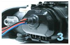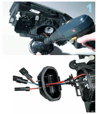 Pasul Deconectati becurile de la sursa si indepartati mansonul de protectie si detasati becul de faza scurta, lunga sau ambele. Dati o gaura mica in capacul de protectie prin care veti trece firele de la becul xenon si etansati gaura folosind garnitura atasata acestora.