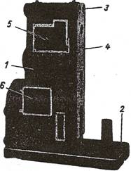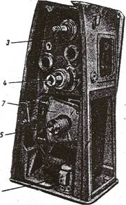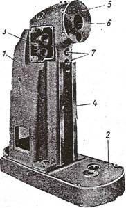 Fig. 8 Corpul si placa de baza ale masinii F V 2a 1 corpuI masinii, 2 - placa de baza, 3 - fereastra pentru montarea mecanismelor de comanda 4 - ghidaje vertlcale; 5 - suprafata de sprijin a capului de frezare; 6.- gaura ciculara pentru arbore!e de antrenare al capului de frezare; 7- locasurile lagarelor arborilor cutiei de viteze |