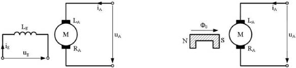 Analiza functionarii servomotoarelor de curent continuu se realizeaza pornindu-se de la setul de ecuatii generale ce caracterizeaza masina de curent continuu (figura 8.3), in care pentru infasurarea de excitatie s- a utilizat indicele "E", iar pentru infasurarea rotorica indicele "A". In figura 8.4 s- a prezentat schema de principiu a unui servomotor de curent continuu cu magneti permanenti, servomotor a carui flux de excitatie se presupune constant.