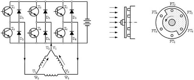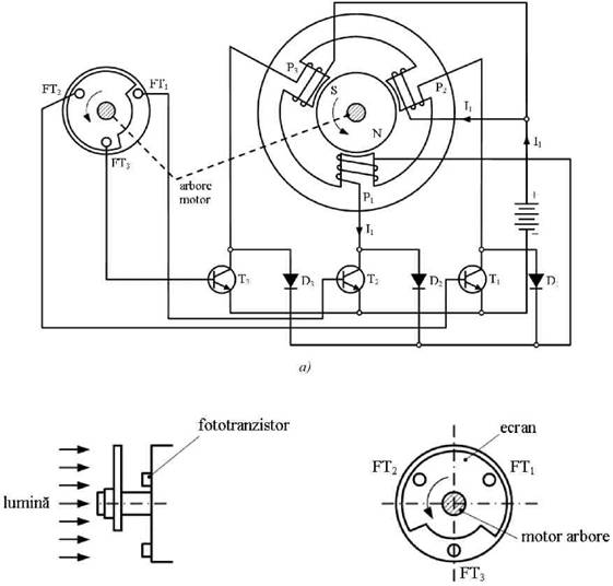 tranzistoare sunt comandate de trei fototranzistoare FT1, FT2, FT3 plasate pe o placa frontala fixata de stator (figura 8.27, a, b) la unghiuri de 120o. Aceste fototranzistoare sunt expuse succesiv la o sursa de lumina cu ajutorul unui ecran mobil, solidar cu arborele, care lasa un fototranzistor expus, in timp ce celelalte doua sunt obturate.