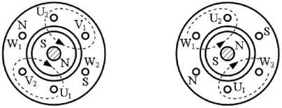 Incepe intervalul 2 din tabelul 1. Curentul debitat prin sursa va trece jumatate prin faza U1 - U2 si jumatate prin faza W2 - W1, a xa statorica mutandu-se pe axa V2 - V1. Rotorul va fi atras spre noua axa statorica s.a.m.d..