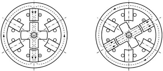 Un prim tip de motor reactiv utilizat deseori in actionarea masinilor-unelte, are statorul cu poli aparenti cu infasurari de comanda concentrate in numar de sase (figura 8.29). Bobinele polilor diametral opusi se conecteaza in serie si cele trei circuite astfel realizate pentru cei sase poli se alimenteaza de la o sursa de curent continuu prin intermediul unui comutator electronic.