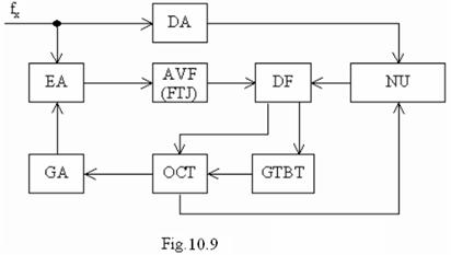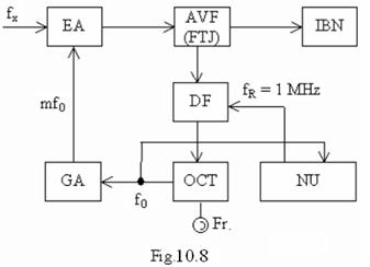 In lipsa semnalului de masurat, nu exista tensiune nici la iesirea AVF. Impulsurile in dinte de fierastrau ale GTBT vor modifica frecventa OCT periodic, intre limita maxima si minima. La aplicarea unui semnal de intrare, aparitia unei tensiuni la iesirea AVF, corespunzator interferentelor nule, va determina blocarea GTBT si intrarea in functiune a buclei PLL. Functionarea este aceeasi, se exclude reglarea manuala a frecventei. DA stabileste valoarea lui m si o transfera numaratorului NU.