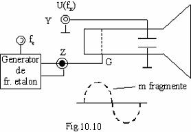 Baza de timp se sincronizeaza cu o tensiune exterioara de frecventa fe cunoscuta, data de un generator de frecventa etalon. Pe placile de deflexie verticala se aplica tensiunea U2 cu frecventa fx care trebuie determinata.