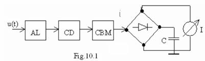 In figura 10.1 se da schema bloc a masurarii frecventei cu o punte redresoare bialternanta.