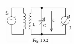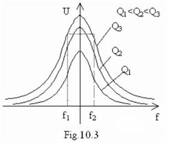 Circuitul LC oscilant paralel (fig.10.2) contine un inductor de valoare fixa L si un condensator variabil C pentru acord. Cu cat circuitul are un factor de calitate mai mare, cu atat maximul curbei de rezonanta este mai pronuntat (curba este mai ascutita) - fig.10.3.