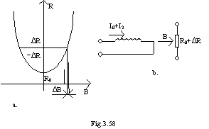 Aceasta relatie poate fi realizata pe baza efectului Gauss, folosind placute de arseniura de indiu, a caror rezistenta se modifica in cāmp magnetic dupa o caracteristica ca cea din fig. 3.58,a. In absenta cāmpului magnetic, valoarea rezistentei este R0. La cāmpuri magnetice slabe rezistenta creste in functie de B dupa o lege patratica, iar pentru valori mari (kGs), dependenta este liniara. Punctul R0 este determinat de o inductie constanta B0, obtinuta cu un curent constant sau un magnet permanent (fig.3.58,b). Daca I2 este proportional cu U2, iar B cu I2, rezulta ?R = kU2. Metoda functioneaza in toate cele patru cadrane, insa are si dezavantaje: constanta k depinde de temperatura, sunt necesare inductii puternice, un cāmp omogen si caracteristici identice ale celor doua magnetorezistente.