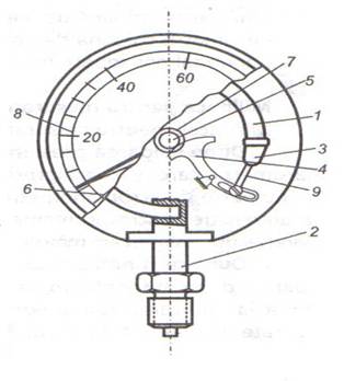 Indica presiunea relativa sau vacuumul. Elementul principal este un tub elastic 1, de sectiunea eliptica. Un capat al tubului 1 este fixat la suportu 2 prevazut cu un canal si cu un niplu prin care se realizeaza legatura cu recipientul a carui presiune se masoara. Capatul 3 al tubului, astupat si liber, actioneaza, printr-un sistem de pirgii 9, asupra sectorului dintat 4. Acesta angreneaza pinionul 5, pe al carui ax este fixat acul indicator 6. Pentru eliminarea jocurilor in angrenaj este prevazut un arc spiral 7.