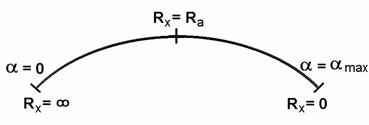 Caracterul scarii ohmmetrului serie rezulta din relatia (9.3) si este aratata in fig. 9.2. Scara are la capatul din dreapta Rx= 0, iar la mijloc Rx= Ra.