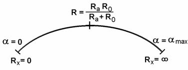 Fig. 9.4. Caracterul scarii ohmetrului paralel. |