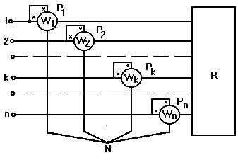 unde k=1, 2, 3, iar neutrul sarcinii (Ns), punctul comun al celor trei wattmetre (N) si cel al retelei (0) au acelasi potential.
