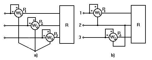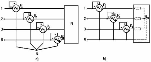 a) schema cu 4 wattmetre; b) schema cu 3 wattmetre.