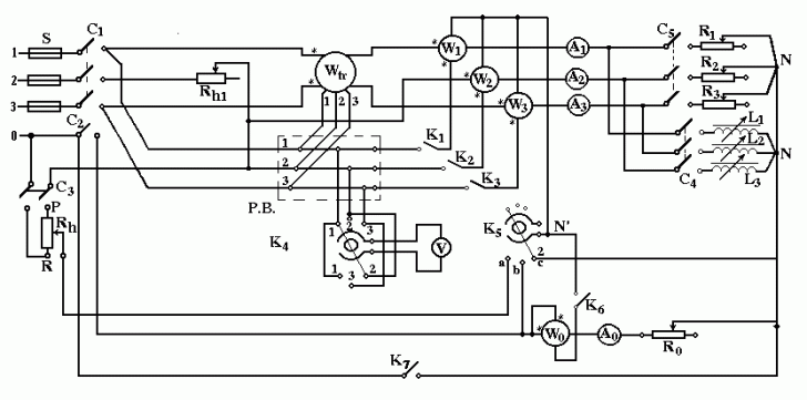 Pentru realizarea tensiunilor simetrice de alimentare necesare la pct.811 se scurtcircuiteaza reostatul Rh1, iar pentru reglajul independent al curentilor pe faza în vederea realizarii sarcinilor simetrice, se închide întreruptorul K , care conecteaza nulul receptoarelor la nulul retelei.