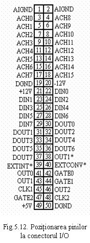 Pinii de la 22 la 37 ai conectorului de intrare-iesire sunt pini destinati conectarii semnalelor digitale de intare/iesire. Pinii 22÷29 sunt destinati intrarilor iar pinii 29÷37 sunt destinati iesirilor. Pinii 19 si 50 sunt pini de masa digitala.