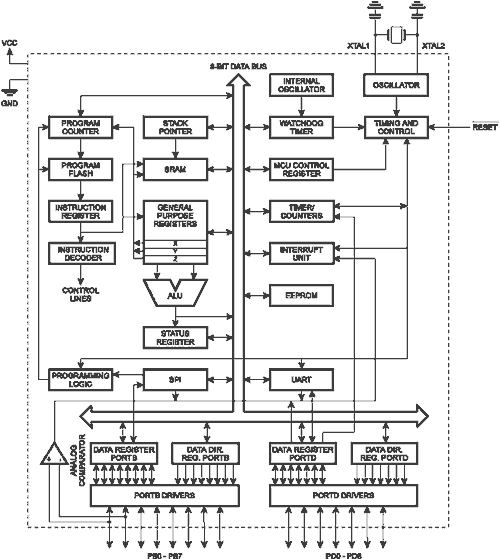 Microcontrolerul este fabricat in tehnologia memorie nevolatila de densitate inalta. Memoria Flash interna, programabila in sistem permite reprogramarea in sistem utilizand interfata seriala SPI sau un programator de memorii nevolatile conventiala. Conbinand un CPU RISC performant pe 8 biti cu memoria Flash programabila in sistem, ATMEL AT90S2313 este un microcontroler puternic care cu proprietatile flexibile si costuri reduse ofera o solutie ideala pentru majoritatea applicatiilor.