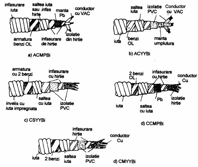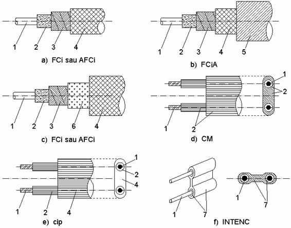 a)-cablu cu conductor din cupru sau aluminiu izolat cu cauciuc;b) cablu cu conductor din cupru armat;c) cablu cu conductor din cupru sau aluminiu izolat cu cauciucsi rezistent la intemperii;d)- conductor în manta de cauciuc cu execusie mijlocie; e)-conductor plat pentru corpuri de iluminat;f)-conductor punte cu izolatie din PVC.