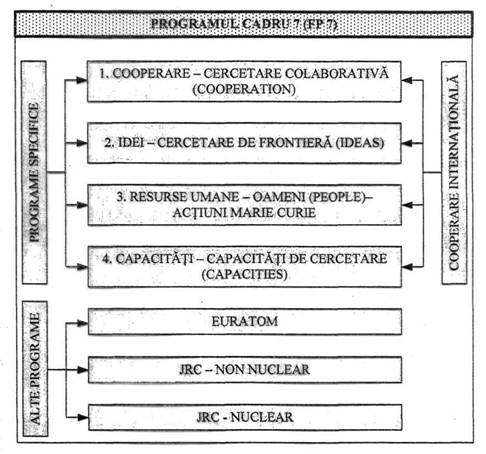 Programul cadru (FP 7) este structurat asa cum rezulta si din schema redata in figura 5.1, pe 4 programe specifice de cercetare la care se adauga programul EURATOM precum si alte doua programe gestionate de Centrul Comun de Cercetare (JRC - Joint Research Center) si anume programul de Actiuni directe in EURATOM si Programul de Actiuni Nou - Nucleare (JRC - nuclear si respectiv JRC - non - nuclear).