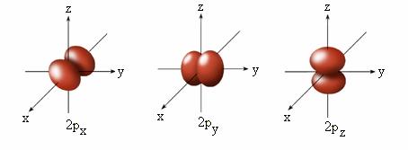 nula, P = 0), functia Notatia lor conventionala este npx, npy, npz. Electronul este uniform distribuit între cei doi lobi, densitatea electronica fiind nula în planul nodal. |