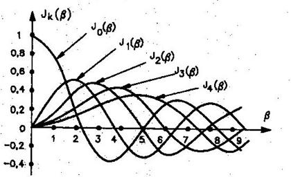 Se observa deci prin modularea in frecventa sau in faza, puterea medie a semnalului nu se modifica, dar ea se repartizeaza tot mai mult pe componentele laterale pe masura ce creste. Dupa cum se poate vedea din fig. 1.21, exista valori ale lui pentru care J0( )=0 , deci purtatorul se anuleaza si toata puterea semnalului este repartizata in benzile laterale.