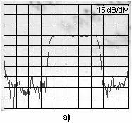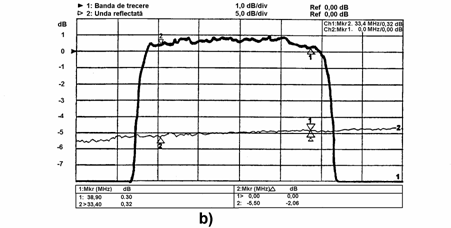 Īn figura 75 este prezentat raspunsul amplitudine/frecventa a unui filtru SAW utilizat īn amplificatorul de frecventa intermediara. Atenuarea īn afara benzii de trecere este foarte mare (> 50 dB) si este ilustrata īn figura. 75 a. Uniformitatea caracteristicii (fig. 75 b) īn banda de trecere este de asemenea foarte buna. Īn aceasta figura scara verticala a fost marita foarte mult pentru a pune īn evidenta variatiile palierului care sunt mai mici decāt 1 dB. Tot pe aceasta caracteristica se poate vedea si adaptarea filtrului, respectiv unda reflectata (2).