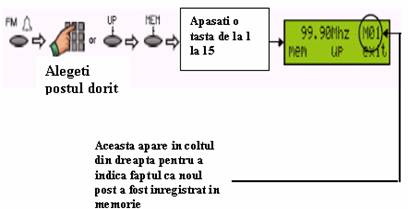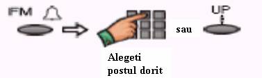Se poate utiliza tastatura pentru a introduce frecventa postului dorit (in 4 cifre) sau se poate utiliza tasta "UP" pentru a avansa la urmatoarea frecventa gasita. Daca nu e apasata nici o tasta timp de cateva secunde, ecranul tastaturii va reveni la starea de "Standby". Apasati tasta [FM] pentru a reveni la afisarea modului radio.