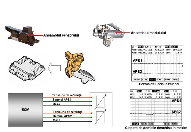 Ambele potentiometre sunt alimentate cu 5V, dar semnalul pe modulul de control este de doua ori mai mare pe potentiometrul 1 decat pe potentiometrul 2 (0-5 pe unul si 0-2.5 pe celalalt). Astfel sunt asigurate, atat functionarea, cat si diagnoza senzorului de pozitie. Cand unghiul senzorului depozitie este mai mic de aproximativ 9 grade, potentiometrele sunt in pozitia de ralanti, iar tensiunea pe modulul de control este mai mica de 1.1V sau, respectiv, 0.55V.