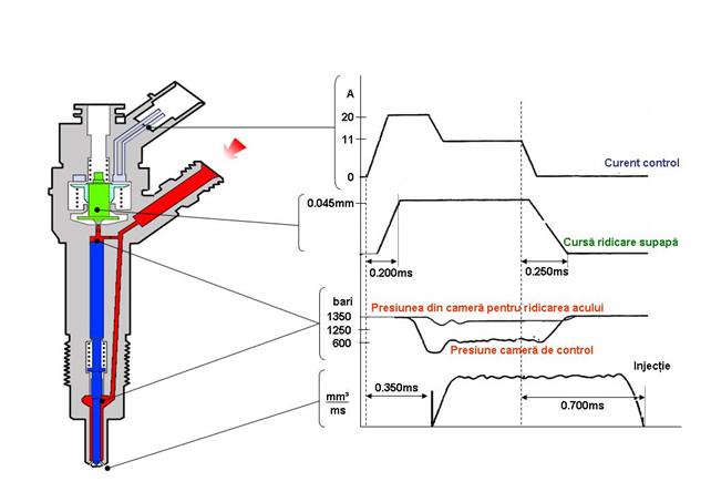 Rolul injectorului este de a injecta cantitatea necesara de combustibil la momentul potrivit, cu variatii ale volumului injectat si ale momentului de incepere a injectiei. Presiunile maxime de injectie sunt de aproximativ 1600 bari. Fortele ce trebuie invinse pentru a ridica acul injectorului sunt foarte mari. Din aceasta cauza, controlul direct al injectorului folosind un dispozitiv electromagnetic este imposibil, cu exceptia situatiei cand se folosesc curenti de intensitate foarte mare, ceea ce ar fi incompatibil cu timpul de reactie necesar pentru injectiile multiple. Injectia este controlata indirect prin intrebuintarea unei supape care controleaza presurizarea sau depresurizarea camerei de control situata deasupra acului.