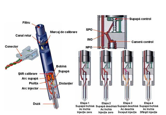 Cand este necesar sa se ridice acul (la inceputul injectiei), supapa este deschisa pentru a se depresuriza camera de control in circuitul de retur. Cand acul trebuie sa se inchida (la sfarsitul injectiei), supapa se inchide din nou astfel incat presiunea in camera de control este restabilita. Efortul necesar pentru actionarea supapei trebuie sa fie minim, ceea ce inseamna ca supapa trebuie sa fie in echilibru hidraulic in pozitia inchisa. Forta arcului asigura contactul dintre supapa si scaunasul sau. Pentru a ridica supapa, este necesar sa se invinga forta arcului. Distantierul este situat sub suportul supapei. El integreaza camera de control si cele trei orificii calibrate necesare pentru functionarea injectorului. Cele trei orificii sunt: orificiul de alimentare (Nozzle Path Orifice – NPO), orificiul pentru depresurizarea camerei de control (Spill Orifice – SPO) si orificiul de umplere a camerei de control (Inlet Orifice Control – INO).