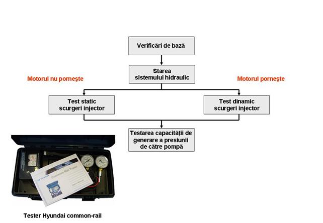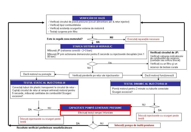 Testul (static) al scurgerilor injectorului: trebuie masurata curgerea prin circuitul de retur al injectoarelor. Daca motorul nu porneste, este posibil sa se masoare numai curgerea statica prin circuitul de retur (injectoare necontrolate sub presiune inalta).