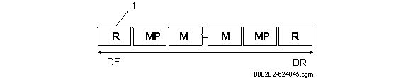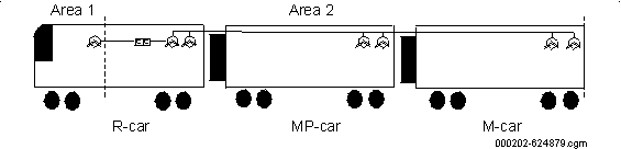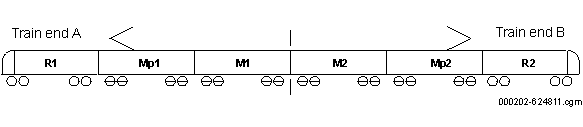 2.1. GeneralitățiTrenul, denumit în continuare și vehicul, este format din 6 vagoane, vezi figura 4 . Vehiculul constă din trei tipuri de vagoane diferite: R (vagon remorcă cu cabină), Mp (vagon motor cu pantograf) și M (vagon motor), în configurația R1 - Mp1 - M1 - M2 - Mp2 - R2.