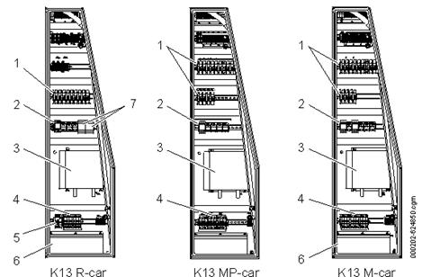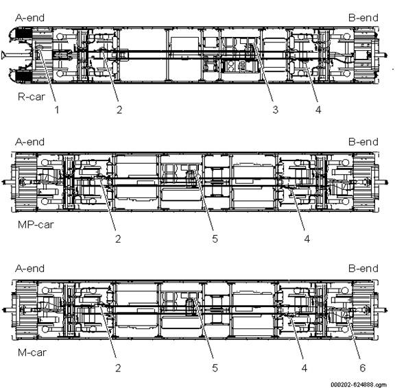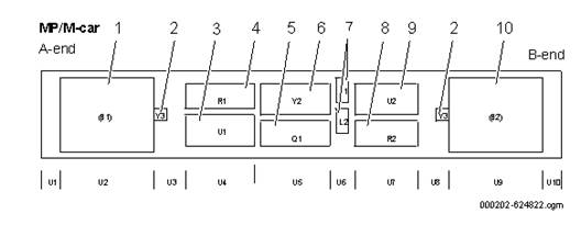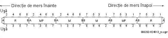 2.4. Echipament interiorBM2 este prevăzut cu următorul echipament interior, vezi figura 8 referitoare la zona pentru pasageri din vagon-R, figura 9 pentru cabina din vagon-R și figura 10 în zona pentru pasageri din vagoanele MP și M.