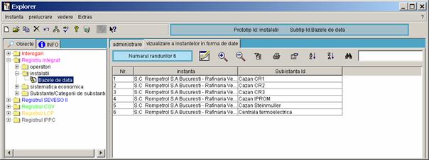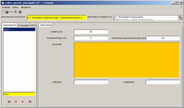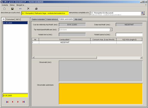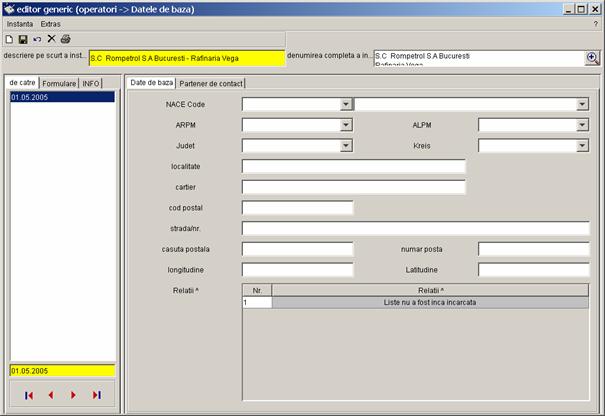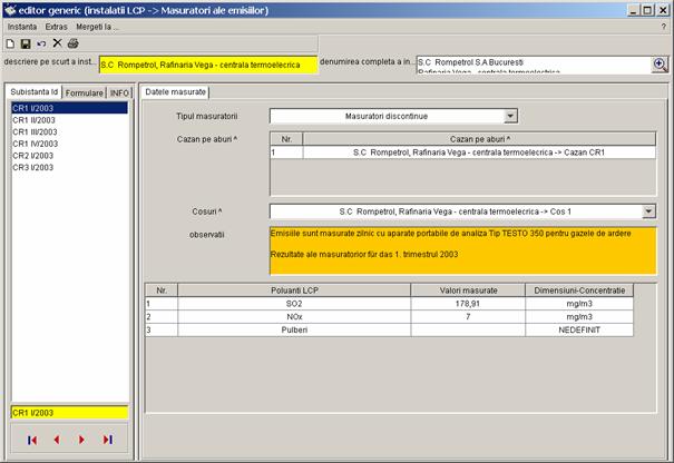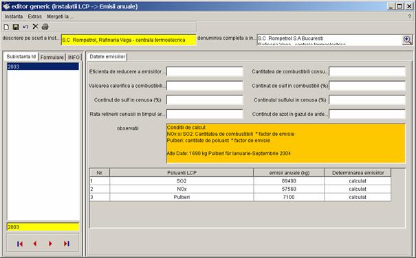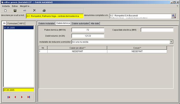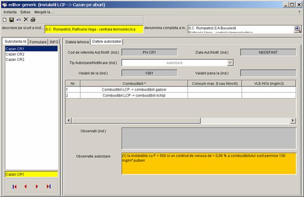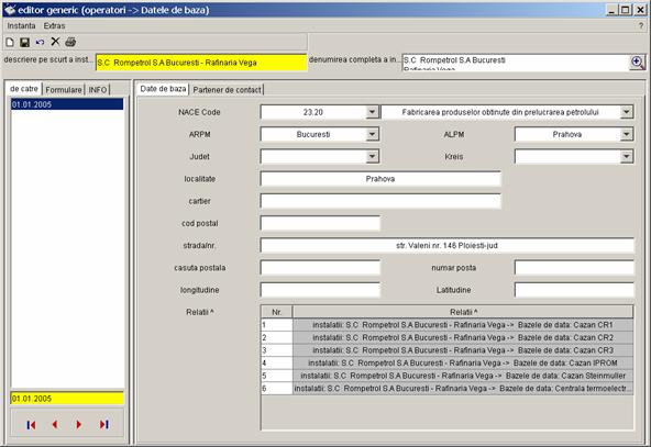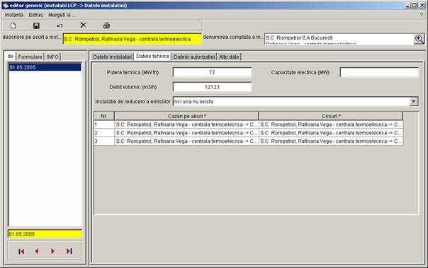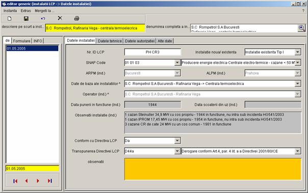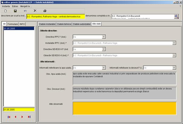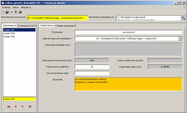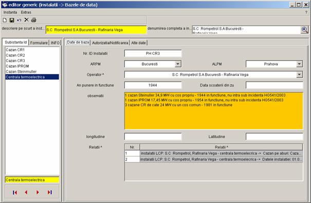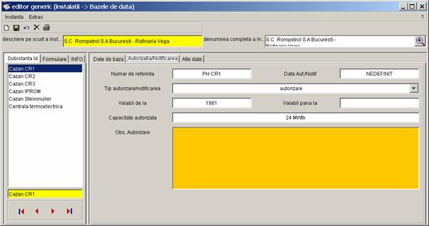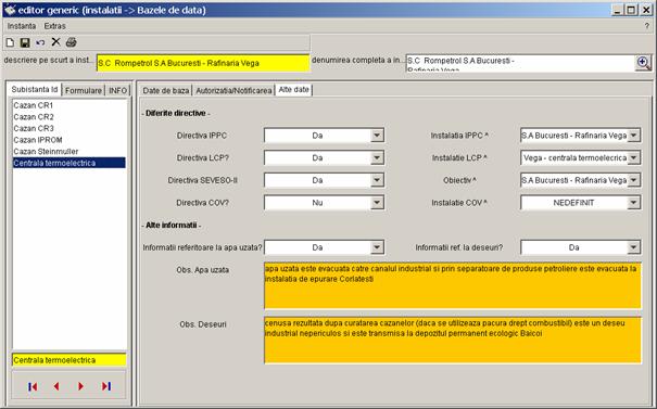 Pe partea stanga a casetei sunt prezentate toate inregistrarile referitoare la instalatia S.C Rompetrol S.A Bucuresti - Rafinaria Vega, care pot fi completate de catre diferiti utilizatori (din alte registre). Vor fi colectate urmatoarele date. |