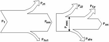 Din puterea mecanica, o parte se transforma in pierderi de frecare si ventilatie Pf,v, o parte acopera pierderile suplimentare care apar in miez in regimul de functionare, PsFe, iar diferenta se transmite axului sub forma de putere utila, Pax: