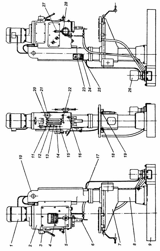 In figura 1.1, s-au facut urmatoarele notatii: 1 - electromotor; 2 - cap de gaurit; 3 - maneta pentru schimbarea turatiilor; 4 - tabela cu regimuri de aschiere; 5 - maneta pentru avans manual sau mecanic; 6 - arbore principal; 7 - suportul mesei; 8 - coloana; 9 - placa de baza; 10 - montant; 11 - buton pornire; 12 - buton oprire; 13 - buton pornire sens invers; 14 - deplasare cap de gaurit; 15 - blocare cap de gaurit; 16 - vizor nivel ulei; 17 - priza pompa; 18 - blocare suport masa; 19 - deplasare suport masa; 20 - indicator de adancime; 21 - schimbator avansuri; 22 - cuplaj limitator adancime; 23 - comutator principal; 24 - comutator lumina; 25 - comutator pompa; 26 - pompa; 27 - inversor la filetare; 28 - limitatoare