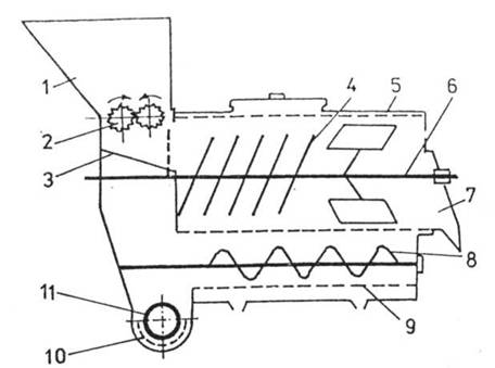 1-palnie de alimentare, 2valturi canelate, 3-melc transportor, 4-racord evacuare must, 5-palnie evacuare mustuiala scursa, 6-cilindru perforat